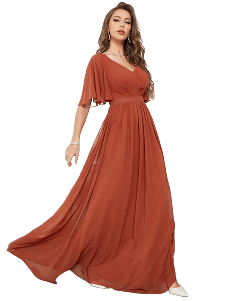 - فستان فخم نسائي يتميز بتصميم عصري يجمع بين الحاشية الأنيقة والأكمام القصيرة التي تضيف لمسة من العصرية على الفستان.